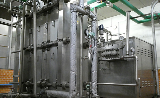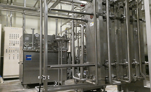 A high-pressure homogenizer breaks down the fat globules in the raw milk to prevent separating and surfacing. Then, the milk is sterilized (heated to 130°C for two seconds) using a plate heat exchanger, and is immediately cooled after sterilization.